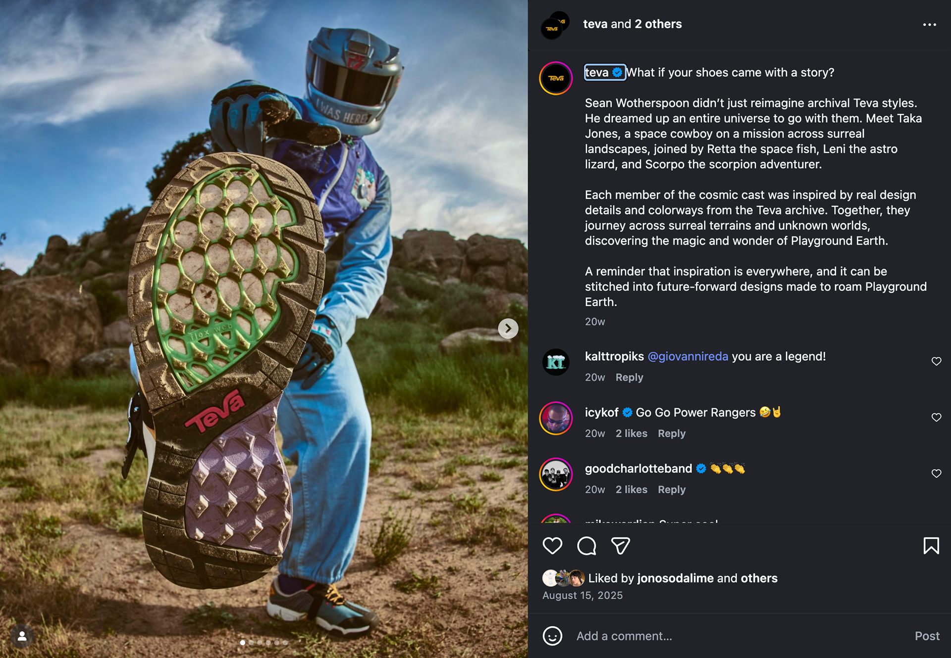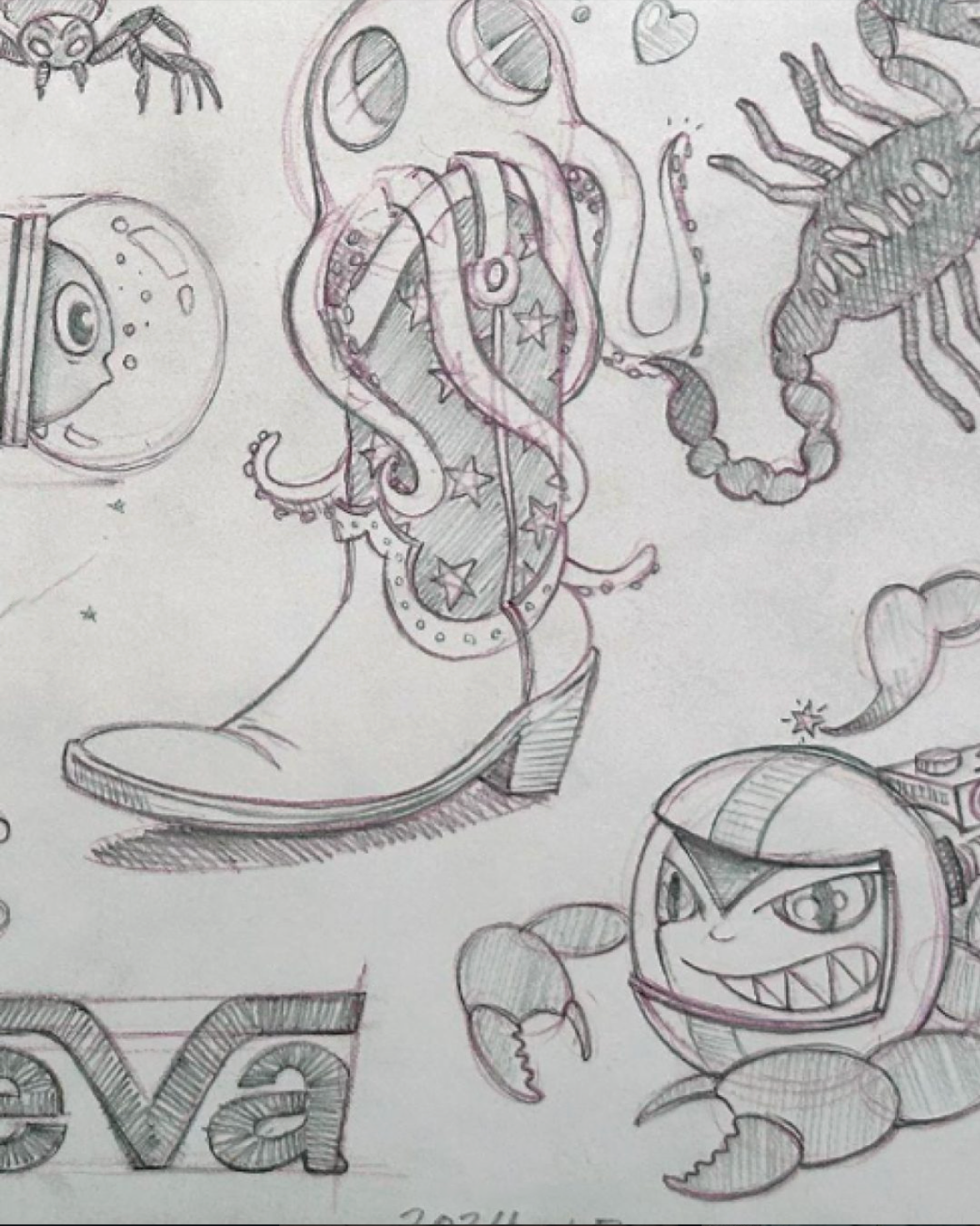 Inspired by conversations with Sean, we built a far-out story about futuristic space cowboys discovering Earth. I developed characters based on archival Teva imagery, then turned those drawings into full-scale mascot costumes. We directed photo and video shoots featuring the creatures wearing the footwear, bringing the world to life through movement and humor.